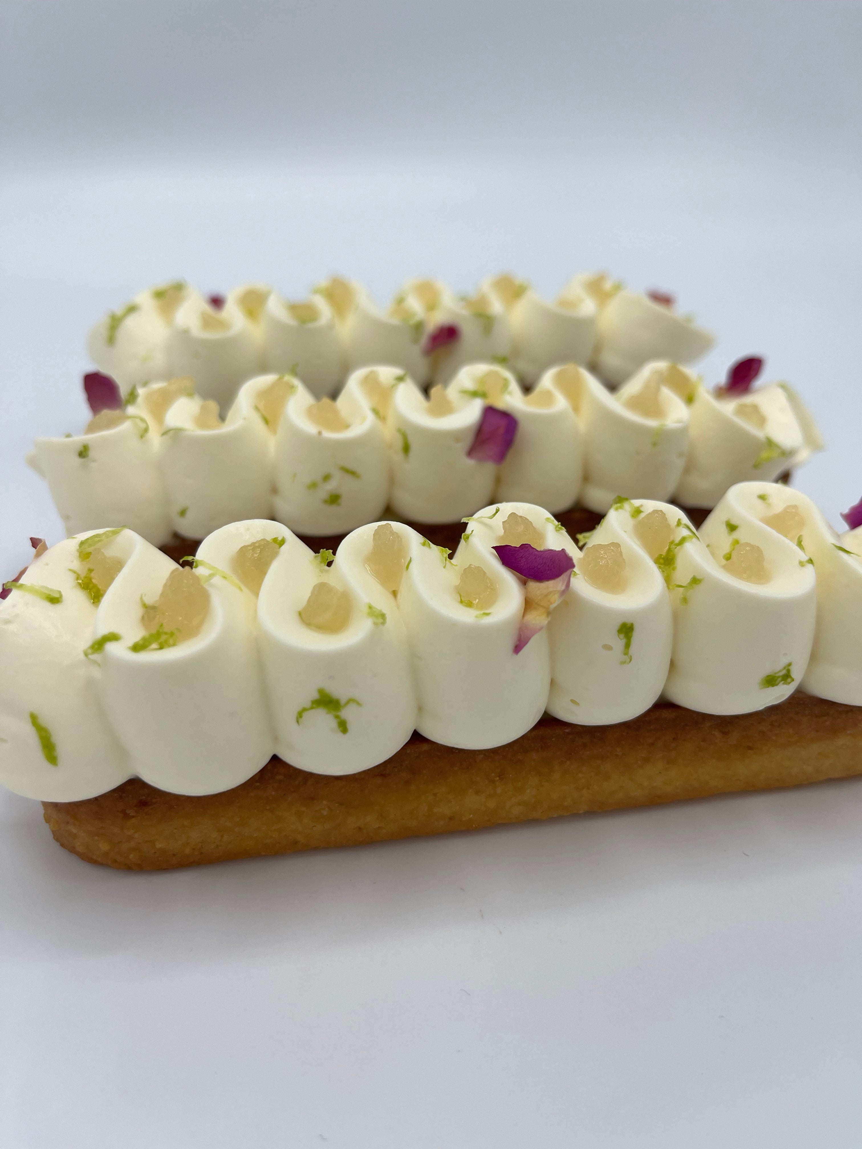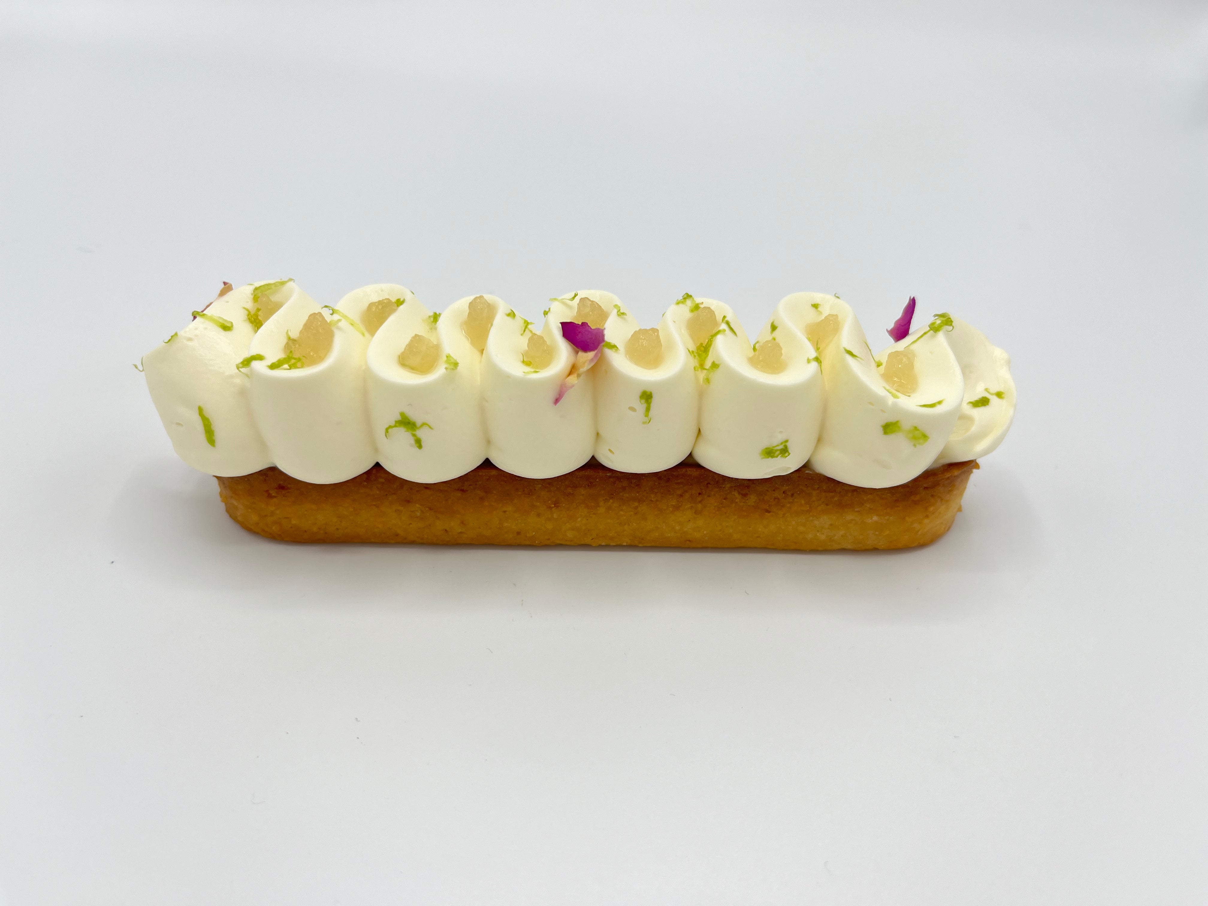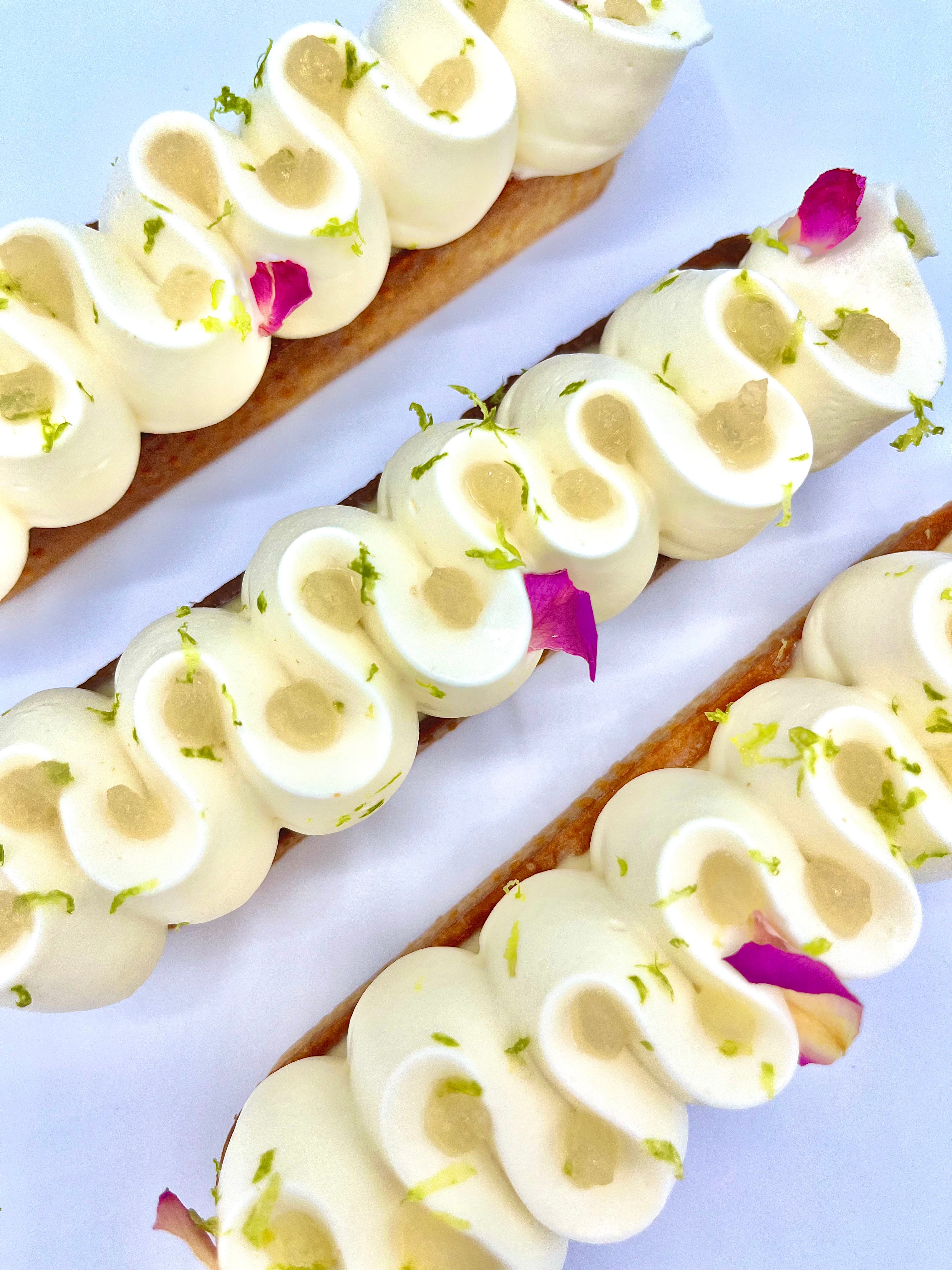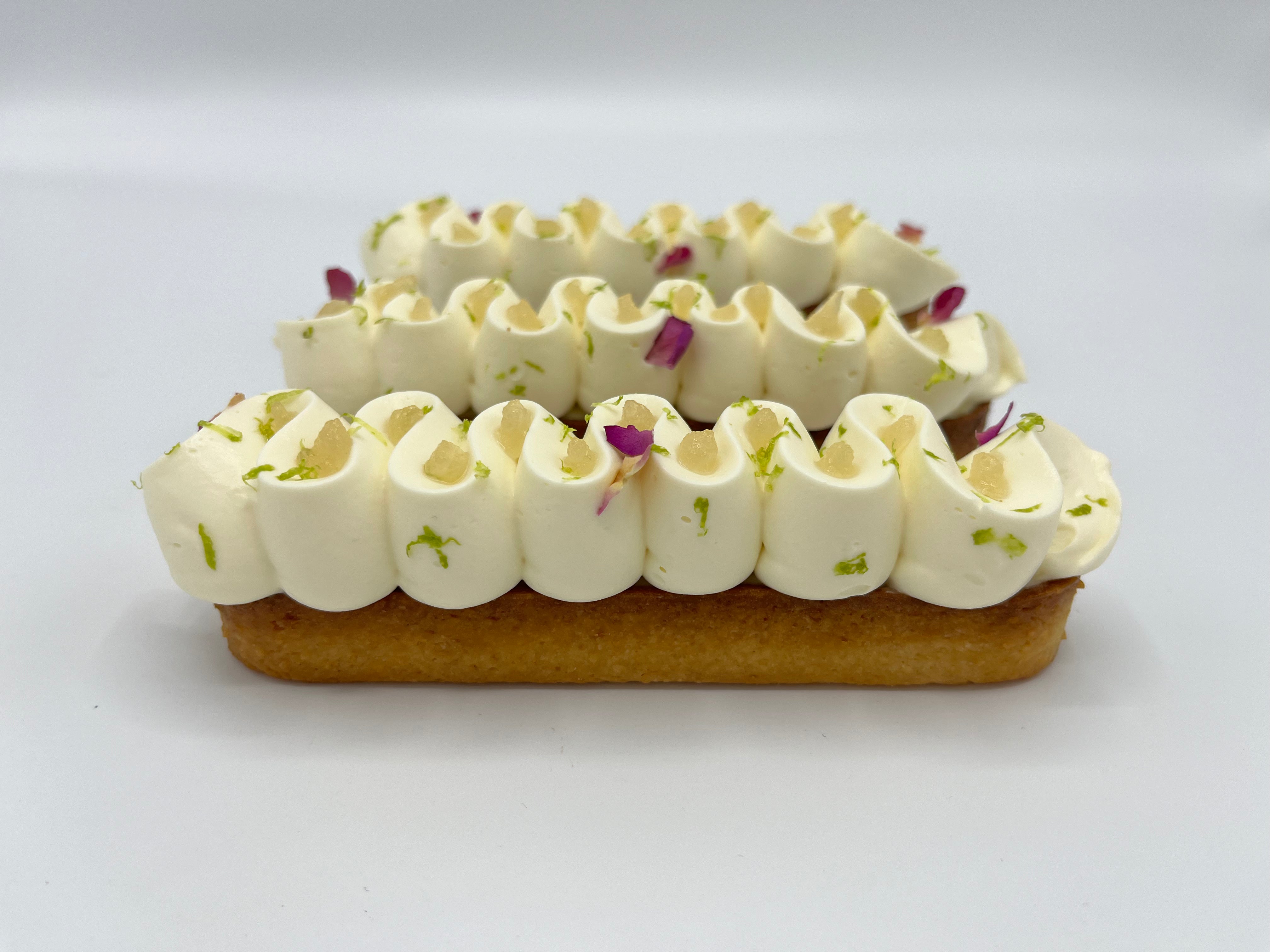Oui, 3 citrons ! Un mélange de textures et de saveurs acidulées autour de trois variétés de citrons : le citron jaune, le citron vert et le citron yuzu. Cette tarte est composée d’une pâte sucrée, d’une crème d’amande, d’un crémeux citron, d’une ganache montée au yuzu et d’un gel de citron vert. Le tout sublimé par des pétales de fleurs séchées et des zestes de citron vert.