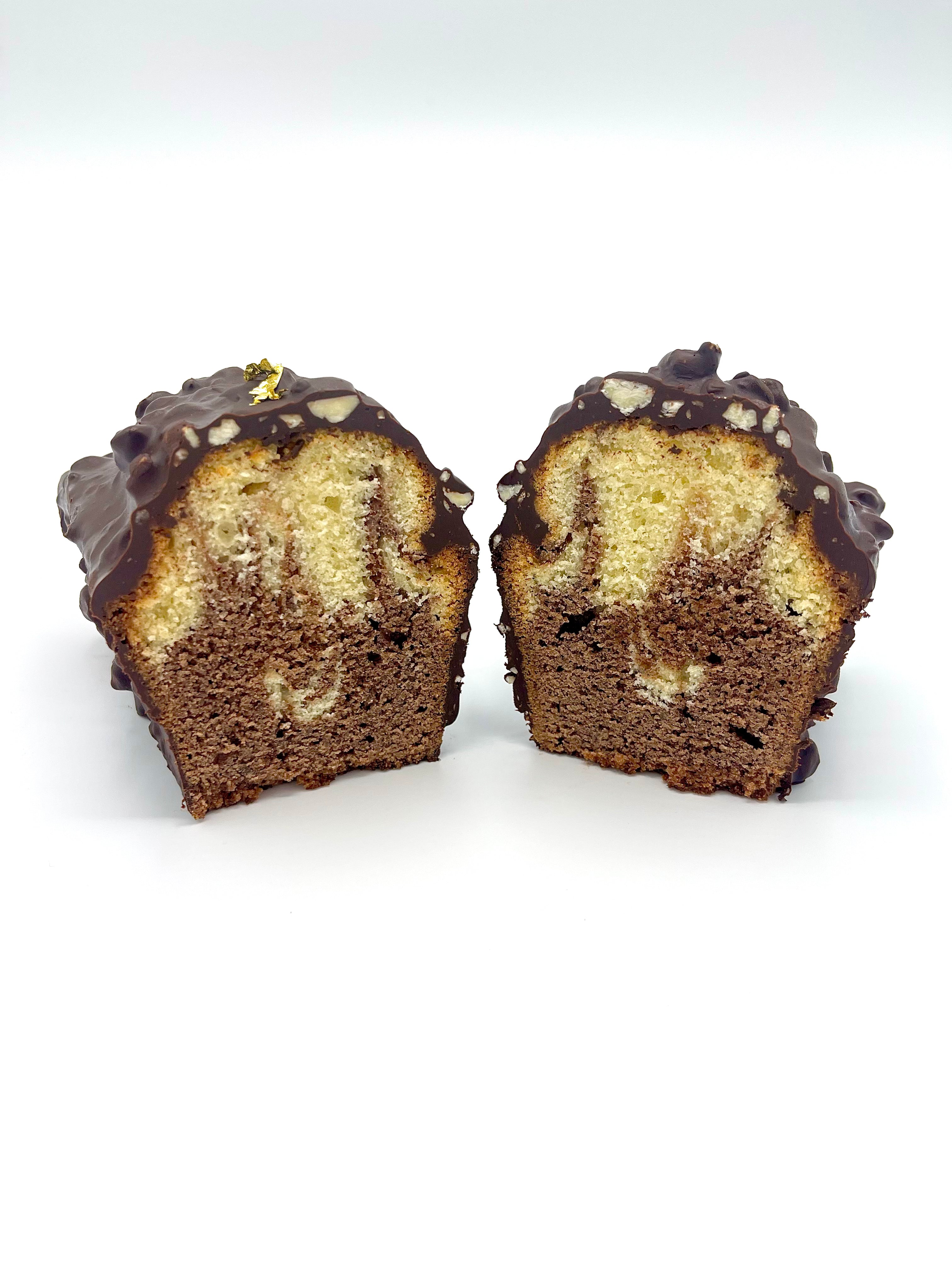 Le bon cake marbré de notre enfance revisité avec un enrobage gourmand au chocolat et aux éclats d’amandes. À la fois moelleux et croquant, avec des saveurs de chocolat et de vanille.